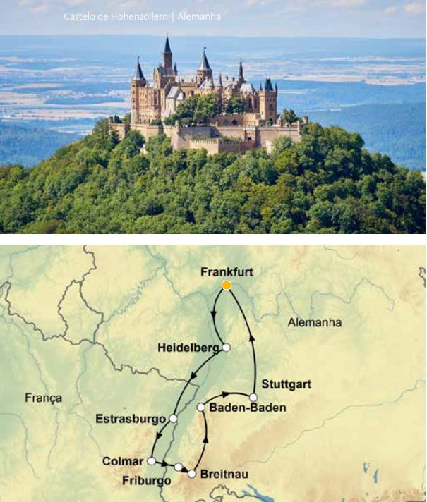 . Guia acompanhante bilíngue em espanhol e português do 2° ao 7° dia. 7 dias de viagem passando por Frankfurt, Heidelberg, Estrasburgo, Colmar, Friburgo, Vogtsbauernhof, Cascatas de Triberg, Friburgo (Floresta Negra), Lago Titisee, Breitnau, Castelo Hohenzollern, Baden-Baden, Stuttgart, Frankfurt (sem hospedagem)